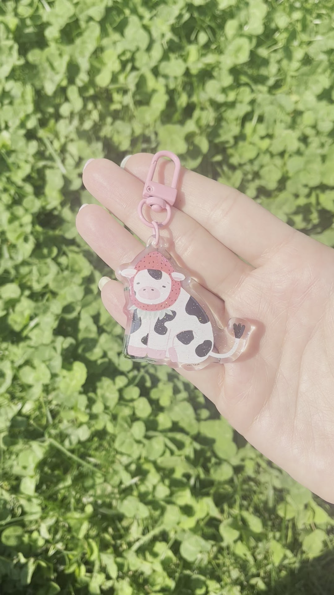 cow with strawberry hat acrylic keychain with tiny glitter specks on top and a pink plastic oval hook