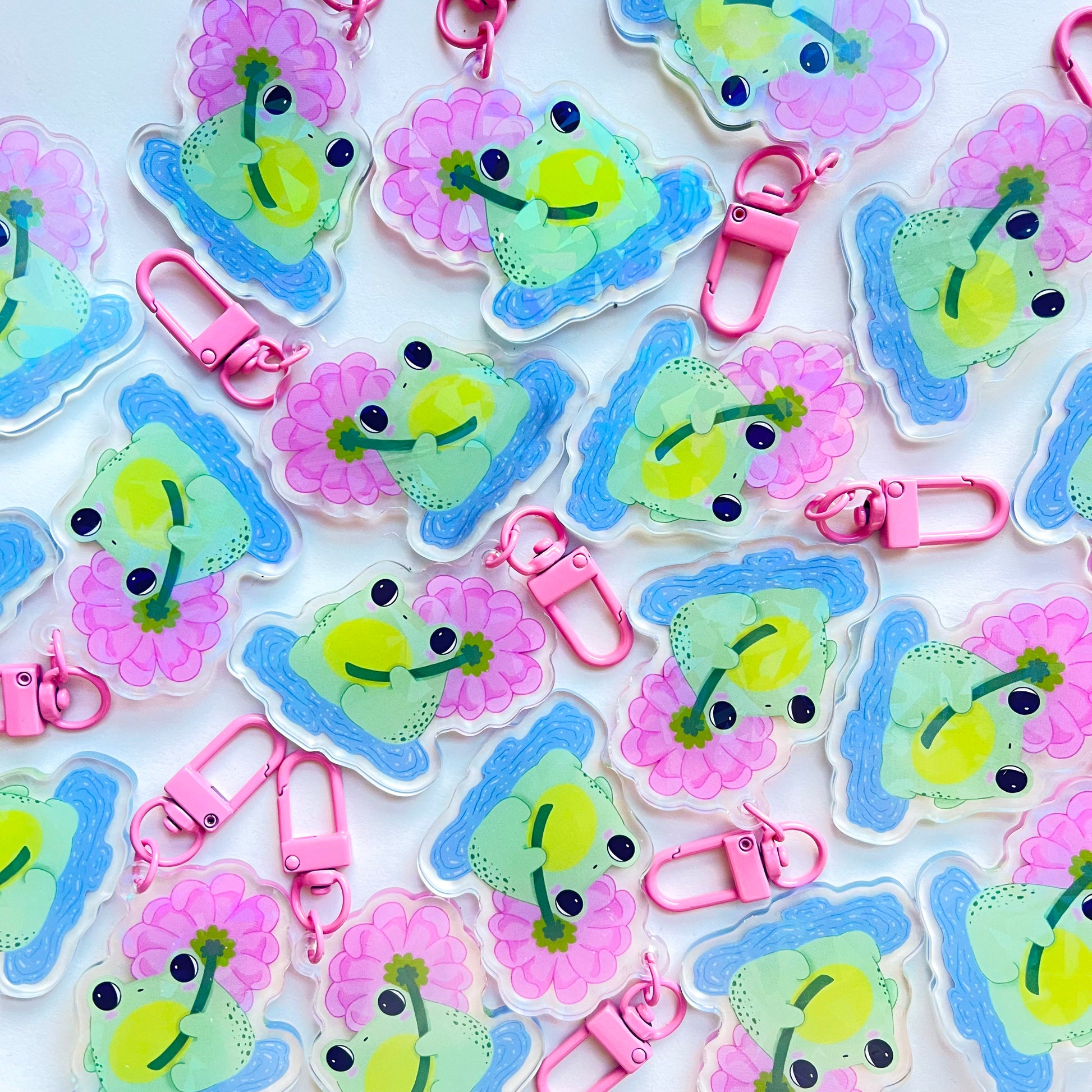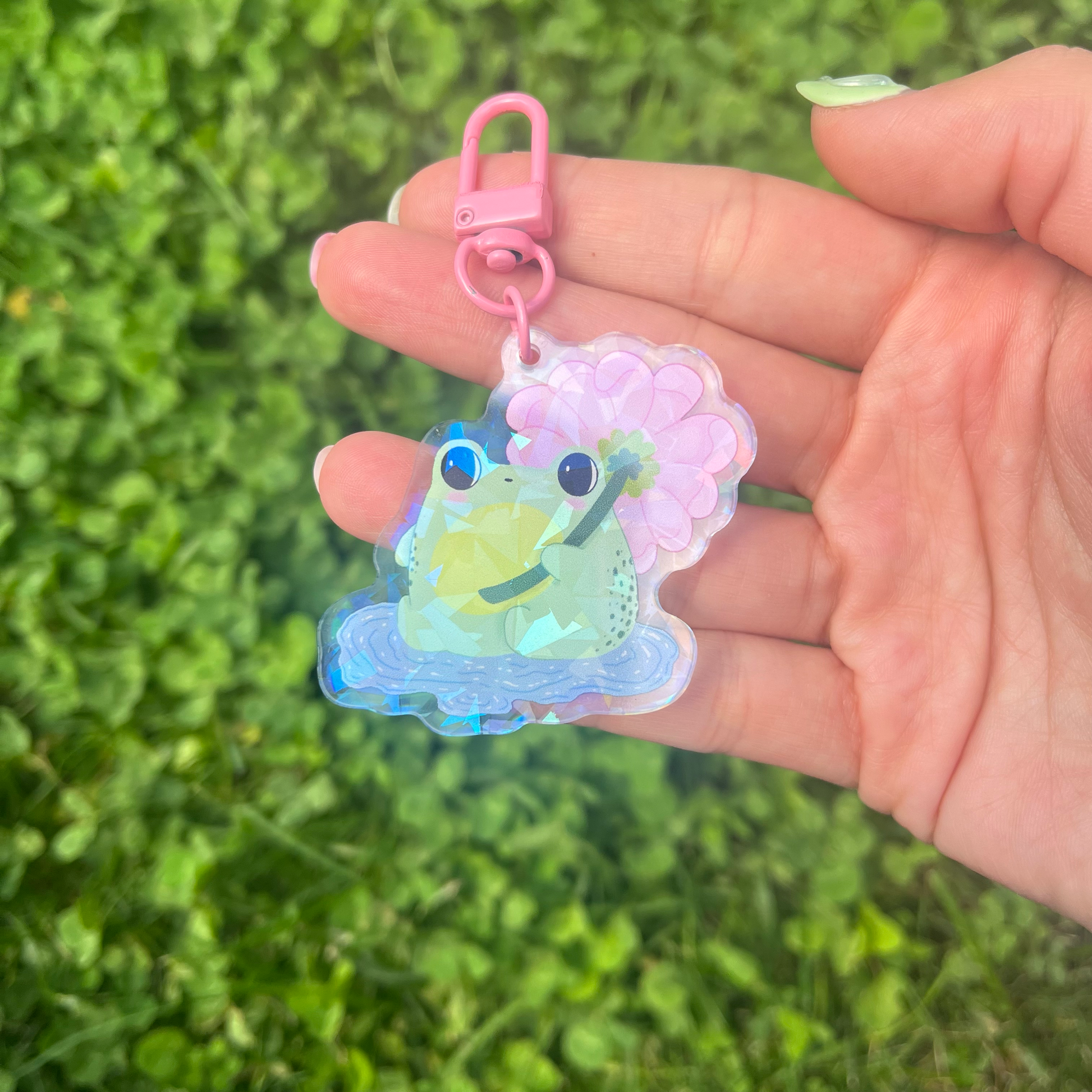 Porte-clé grenouille en acrylique, avec morceaux holographiques et un anneau d'attache ovale en plastique rose